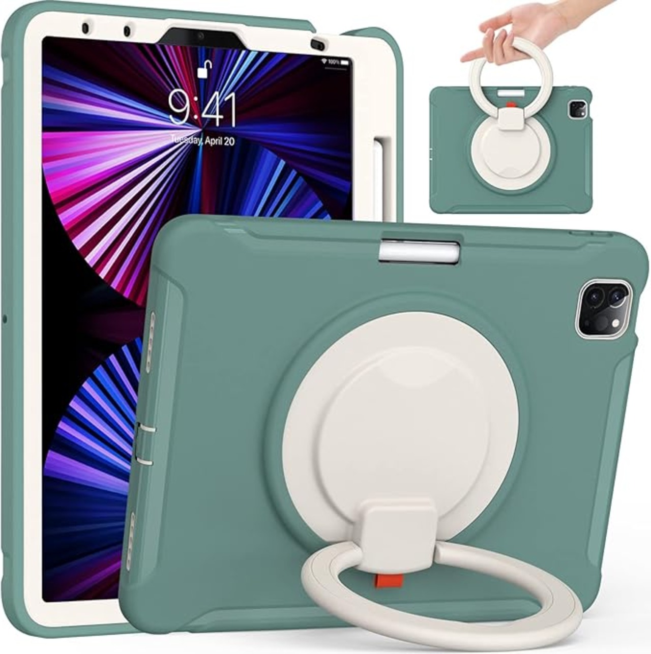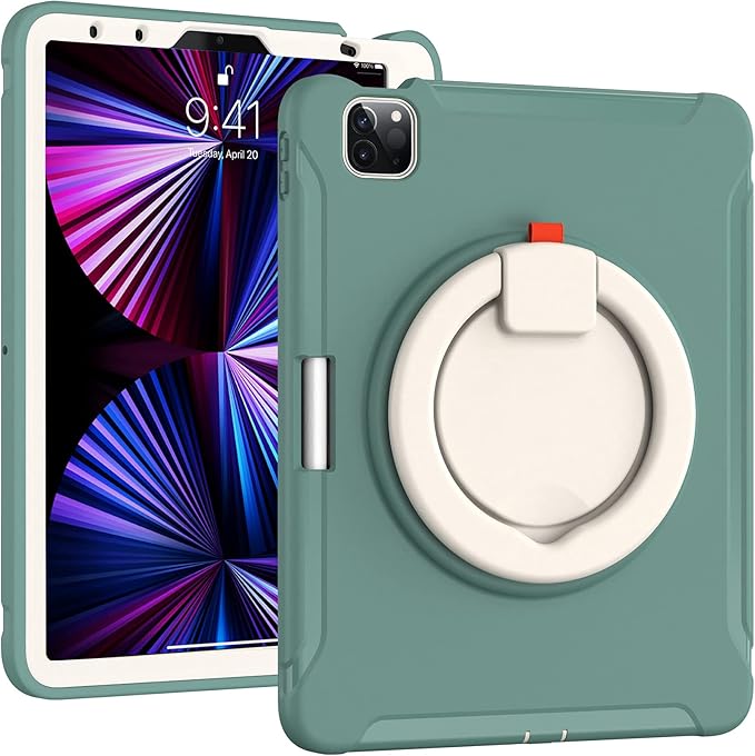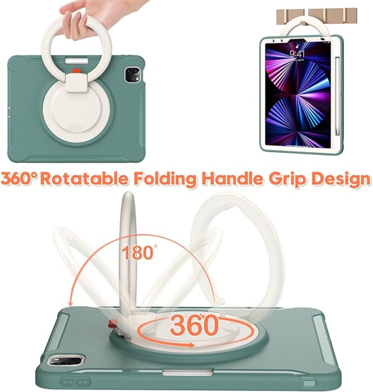 iPad Air 11インチ (M3、M2,2025新型、2024年) ケース iPad Pro 11 第4/3/2/1世代 ケースリング付き 衝撃吸収 軽い 頑丈 360度回転スタンド iPad Air 5 Air4 2022/2020 ケース 持ち手付き 落下防止 Pencil 收納,翡翠