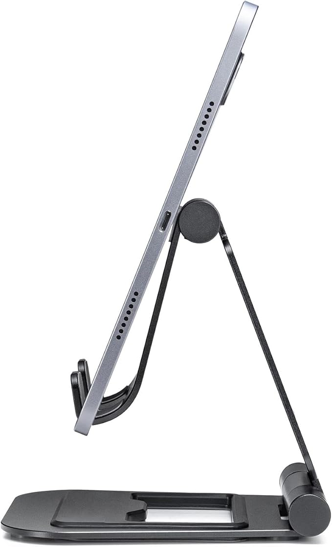 2つのヒンジを搭載し角度と高さの調整ができるアルミ製のタブレット用デスクトップスタンドです。