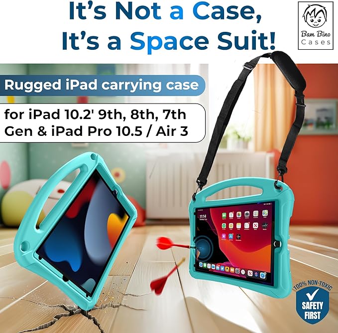 Bam Bino Cases SPACE SUIT ショルダーストラップ スクリーンガード ペンシル収納付き 耐衝撃 キッズ ケース 【 iPad 10.2 第9世代 /第8世代 / 第7世代 / Air 10.5 2019 第3世代 / Pro 10.5 2017】 子供 画面保護 スタンド 軽量 (ターコイズブルー)
