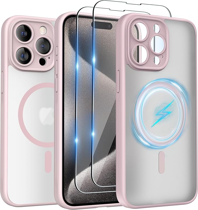 SURPHY iPhone15 pro用ケース 半透明 MagSafe対応,フィルム付き 6.1インチ対応(2023) 携帯ケース iphone15 プロ(カメラの全面保護)マット感 黄ばみなし 指紋防止 マグネット搭載 (ピンク)