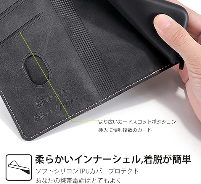 【上質な素材】高品質のPUレザーを採用し、手触りが良く、放熱性も抜群。柔らかいTPUバンパーは取り付け・取り外しが簡単で、スマホ本体への損傷も心配いりません。しっかりとした保護性能を備えています。毎日見るものだから、飽きのこないシンプルデザインを持つ。