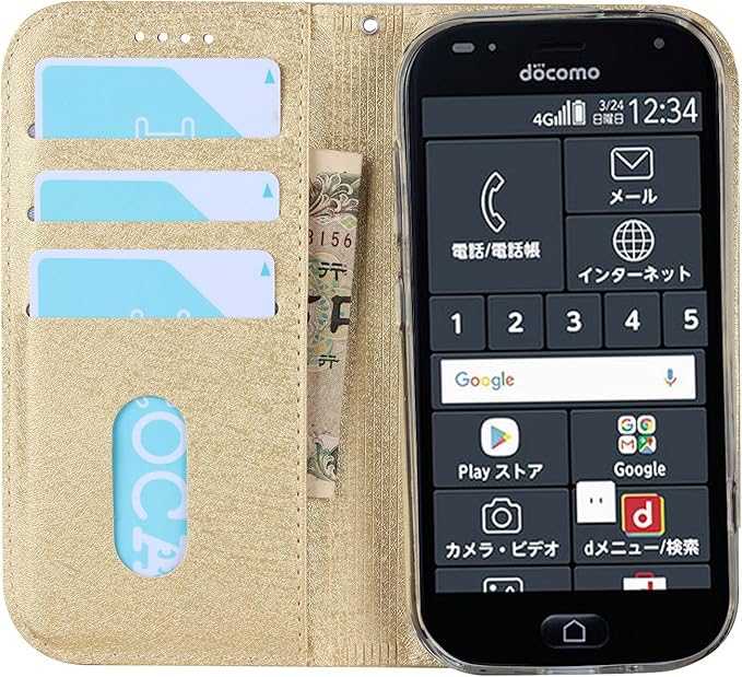 対応らくらくスマートフォン F-42A / らくらくスマートフォン me F-01L 手帳型 シェルノートブックタイプ保護カバーノートブックカード収納側マグネットブラケット機能互換性のある耐衝撃性軽量モダンシンプルファッションPUレザー折りたたみ式フル保護カバー男性と女性のスマートフォンケース用(ゴールド)