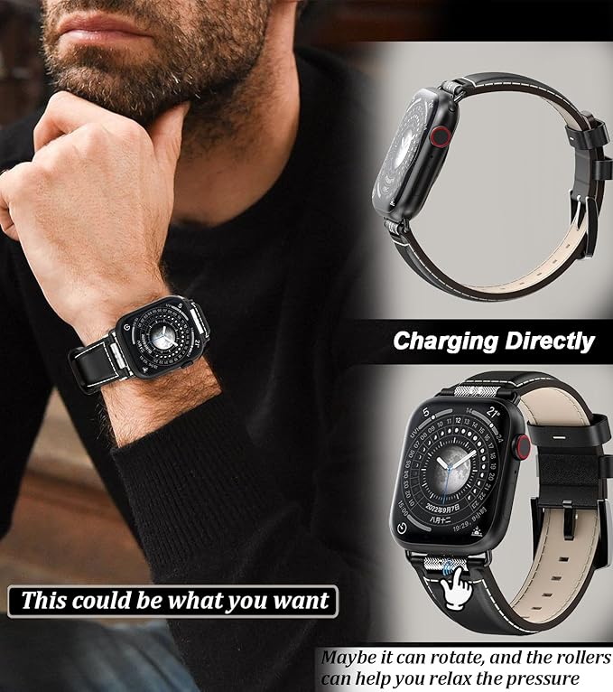 Caseultra Leather Bands and Case Compatible with Apple Watch Band 41mm/40mm/38mm for Men,Genuine Leather Strap for iWatch SE/Series 8/7/6/5/4/3/2/1,Black