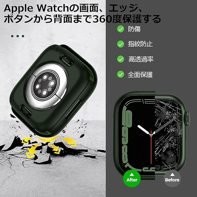 【液晶保護フィルム+保護ケース+背面保護ケースの3 in 1設計】本製品は、Apple Watchの画面、エッジ、ボタンから背面まで360度保護する、Apple Watchケース/フィルム一体型の保護ケース+背面保護ケースの3つの合体設計です。35H硬度の強化ガラスフィルムは、キズに強く耐久性があり、高解像度で高透過率、タッチもスムーズです。PC素材の保護ケースは、落下やキズなどからあなたのApple Watchを保護し、新品の状態を長持ちさせます。