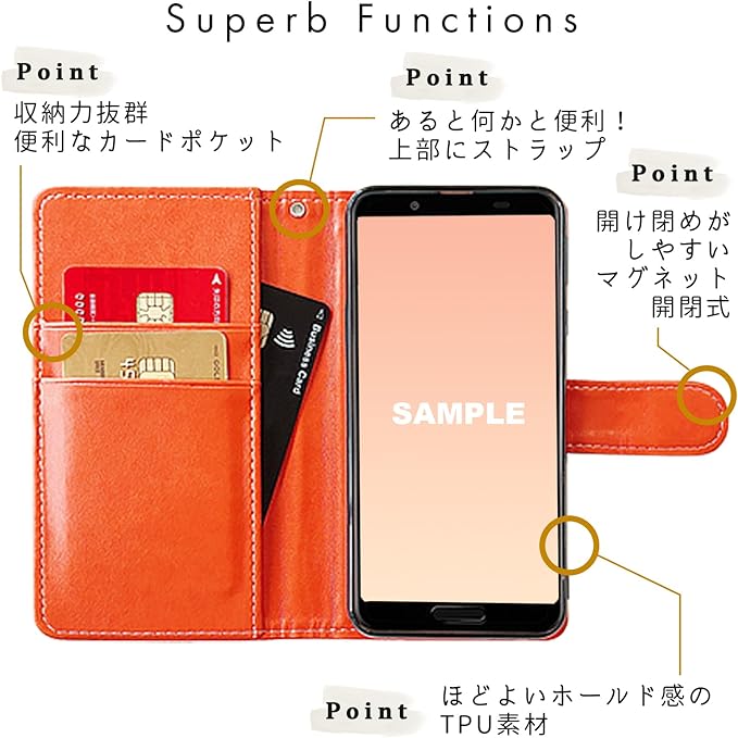 AQUOS wish3 SH-53D A302SH ケース 手帳型 カバー SH53D SH-53Dケース SH-53Dカバー SH53Dケース SH53Dカバー A203SHケース A203SHカバー aquoswish SH-M25 手帳型ケース スマホケース アクオス 手帳 ス 部長 オレンジ
