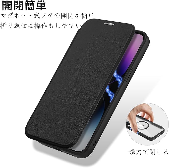 Taosan iPhone 15 Pro Max用 ケース 手帳型 背面クリア Magsafe 対応 PU+PC カード入れ ストラップホール おしゃれ シンプル 薄型 軽量 スマホケース (ブラック)