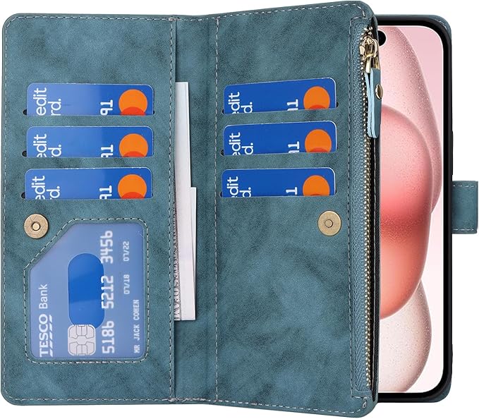 Eastwave アイフォン 15 ケース For iPhone 15 縄掛けケース For iPhone15 手帳型 財布型 ICカード コインポケット ストラップ付き カード 収納 小銭入れ ファスナーポケット付き PUレザー 6色ブルー