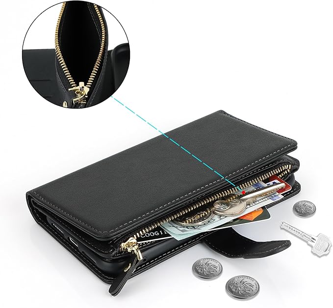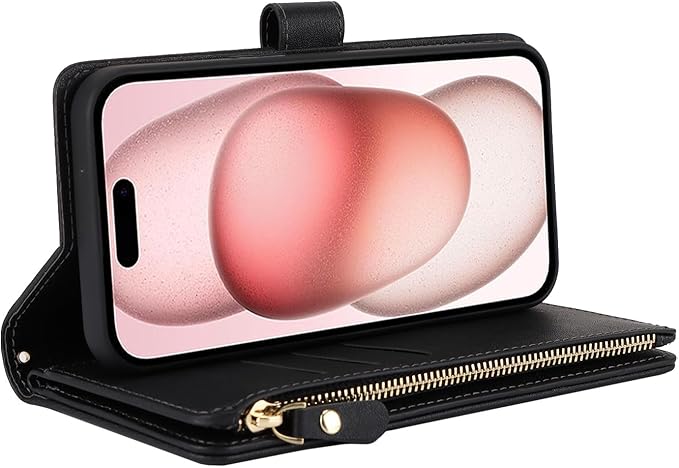 Eastwave アイフォン 15 ケース For iPhone 15 縄掛けケース For iPhone15 手帳型 財布型 ICカード コインポケット ストラップ付き カード 収納 小銭入れ ファスナーポケット付き PUレザー 6色ブラック