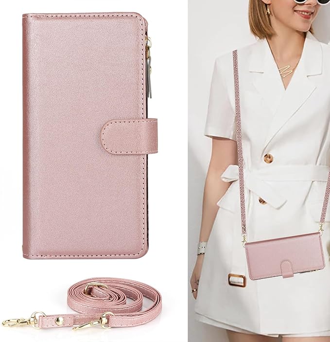 Eastwave アイフォン 15 ケース For iPhone 15 縄掛けケース For iPhone15 手帳型 財布型 ICカード コインポケット ストラップ付き カード 収納 小銭入れ ファスナーポケット付き PUレザー 6色ピンク