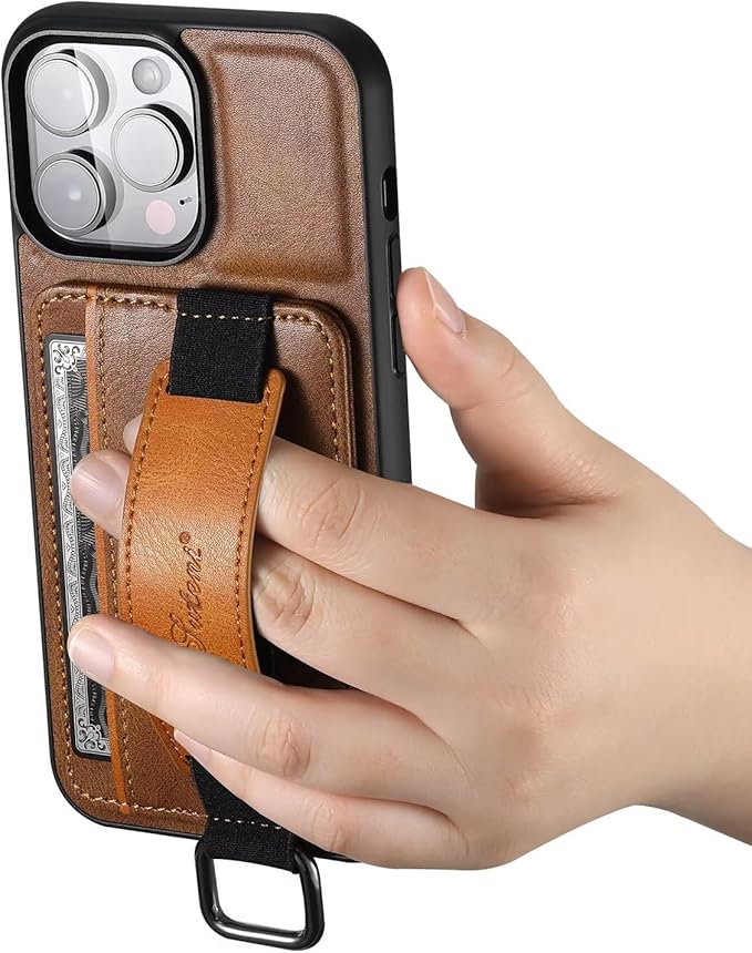 Mcxiancrl iPhone 15 Pro 用 グリップケース ハンディベルト バンパー型 カバー スライド ベルト伸縮性 ハンドメイド 3枚カード収納 ストラップホール ストラップリング バンド リング付き 落下防止 横置きスタンド機能 スリム 薄型 おしゃれ PU レザー