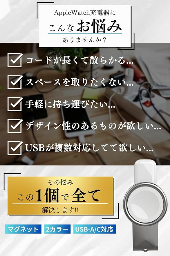【USB-A / Type-C 端子】端子はUSB-A/タイプcのどちらにも対応しており、PC・モバイルバッテリー・コンセントタップなどからAppleWatchに充電が出来ます。