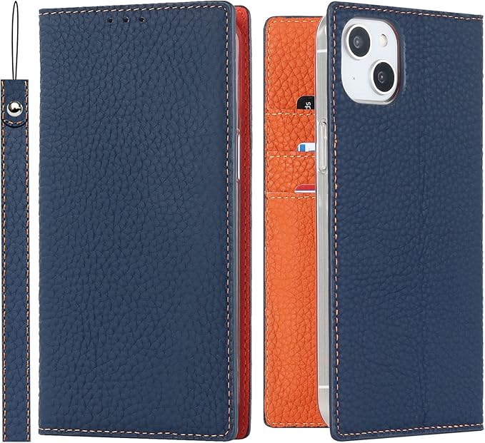 Eastwave アイフォン For iPhone 15 Plus ケース 本革 牛革 For iPhone 15plus ケース 手帳型 For iPhone15plus カバー 手帳 本革 柔らかい 本皮 スプラットホール付き スプラット同梱 内蔵マグネット- ネイビー