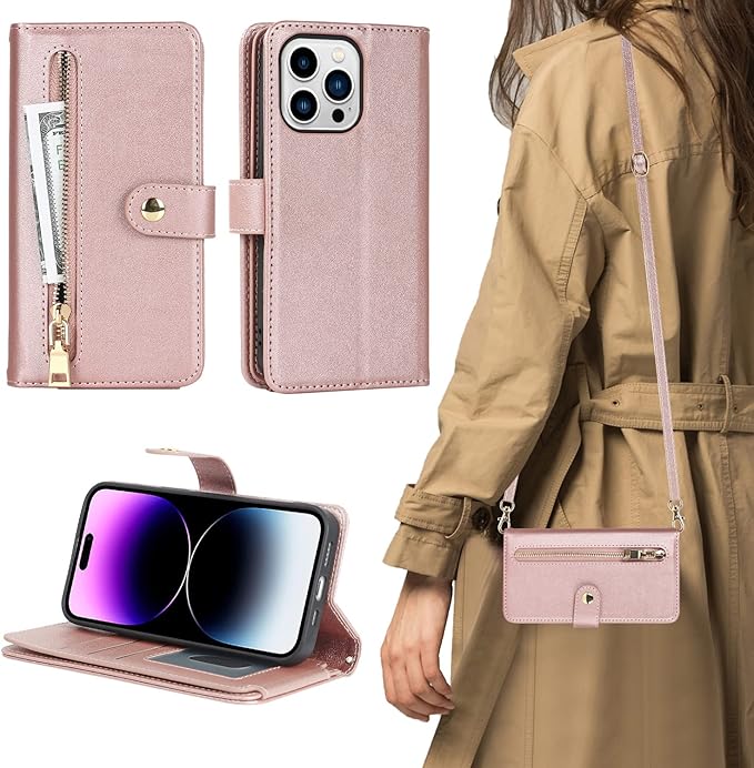 Eastwave アイフォン For iPhone 15 Pro Max ケース 手帳型 For iPhone15promax 縄掛けカバー 手帳 For iPhone 15promax case 長ストラップ付き 肩掛け 革レザー 柔らかいTPU 財布型 カード収納 小銭入 れ スタンド機能 落下防止 5色 ピンク