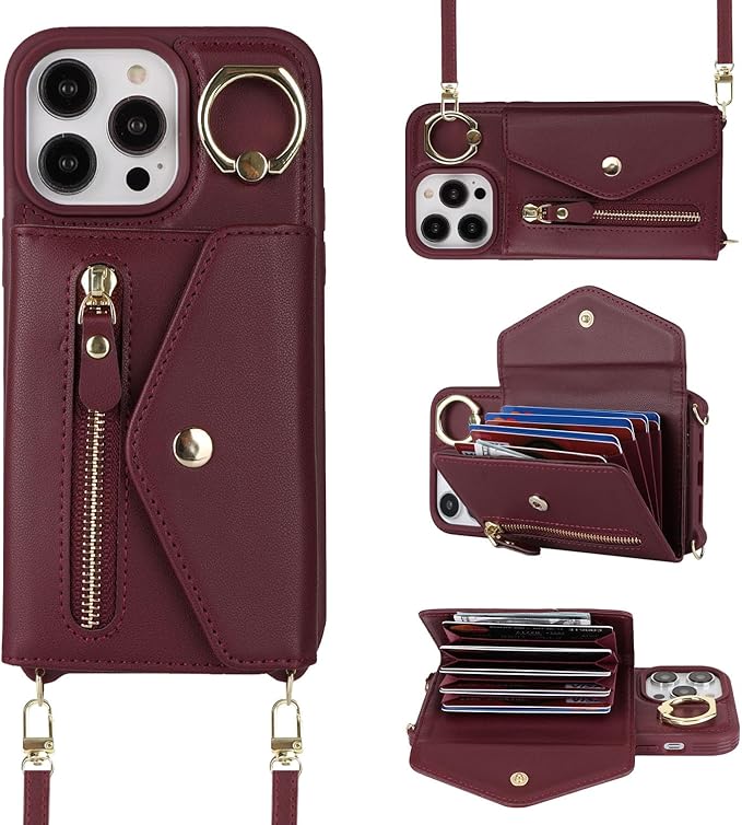 【Hamany】 iphone 14 pro max ケース 手帳型 スマホ ショルダー アイホン14プロマックスケース ショルダー おしゃれ カード収納 大容量 背面 リング付き スタンド機能 スマホケース iphone 14 pro max 耐衝撃 耐久性 女性 肩がけ 首掛け 斜め掛け ストラップ付き 長さ調整可能 カバー -ワインレッド