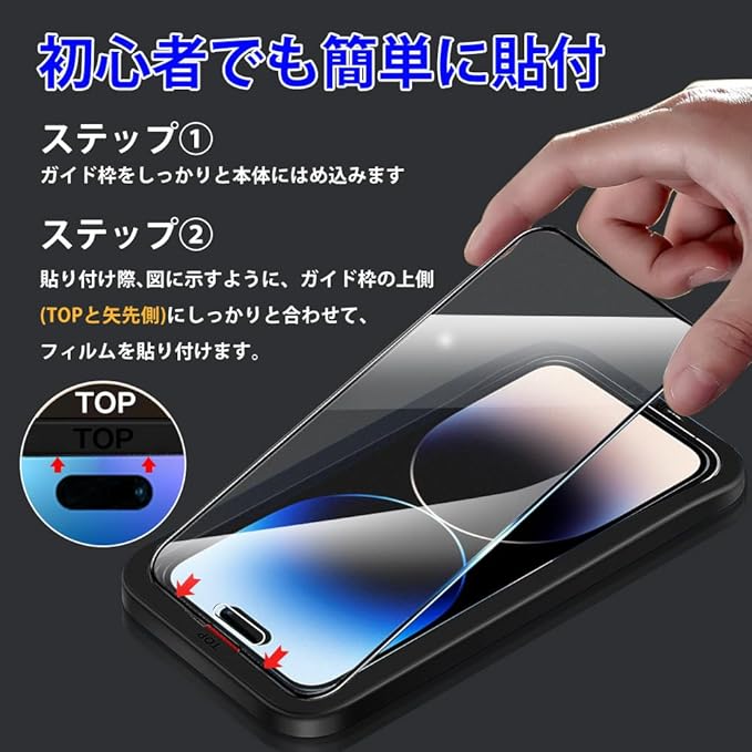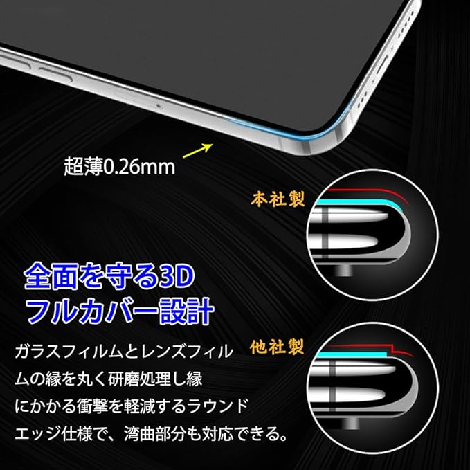【対応機種&包装内容】iPhone 15 Pro Max / iPhone14 Pro Max 専用ガラスフィルム。強化ガラスフィルム【1枚】+カメラフィルム【1枚】+位置決め用のガイド枠【1個】+日本語取扱説明書+貼り付けキット。最先端技術の3Dラウンドエッジ加工により、美しい形状にぴったりフィット、曲面の完全カバーを実現します。位置決め用のガイド枠が付属していますので、ガラスフィルムをスクリーンに揃えるのが簡単になります。画面に置くだけでキレイに貼れ、気泡が入りづらく、初心者でも一発で簡単に貼ることができます。ご注意:貼り付けの際に、万が一少しの気泡や浮きが出てきた場合は、布を指に巻いて少しずつ押し出せば抜けます。もし、それでも解決できなかったら、フィルムを端から気泡や浮きのところまで慎重に爪で押し上げ