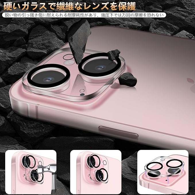 iPhone 15 / iPhone 15 Plus 用 カメラフィルム アイフォン15/15 Plus 対応 カメラ保護フィルム 黒縁取り 露出オーバー防止 硬度9H キズ防止 耐衝撃 防滴 防塵 強化ガラス【2枚セット】