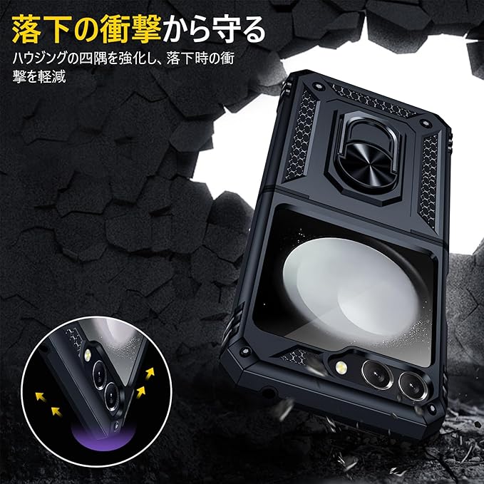 JSTNMEBO Galaxy Z Flip5 5G 用ケース リング付き 衝撃吸収 SC-54D SCG23 ケース 耐衝撃 頑丈 米軍MIL規格 スタンド機能 車載ホルダー対応 TPU PC素材 バンパー サムスン ギャラクシー z flip5 5g 用カバー レンズ保護 滑り止め 擦り傷防止 一体型 全面保護カバー 黒 J03-29