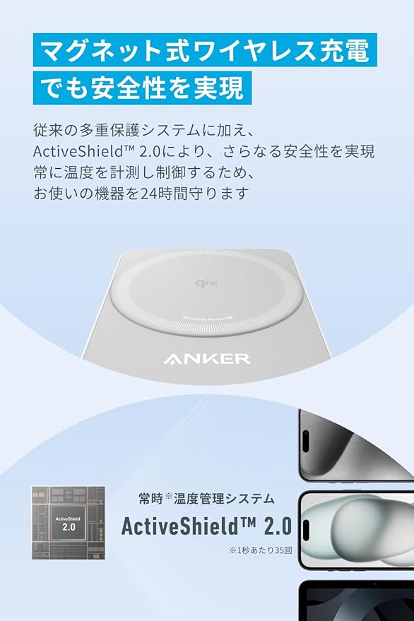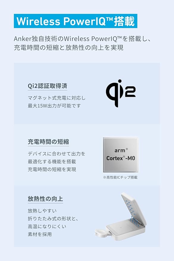 Wireless PowerIQ搭載:Anker独自のWireless PowerIQを搭載し、 充電時間の短縮と放熱性の向上を実現しました。