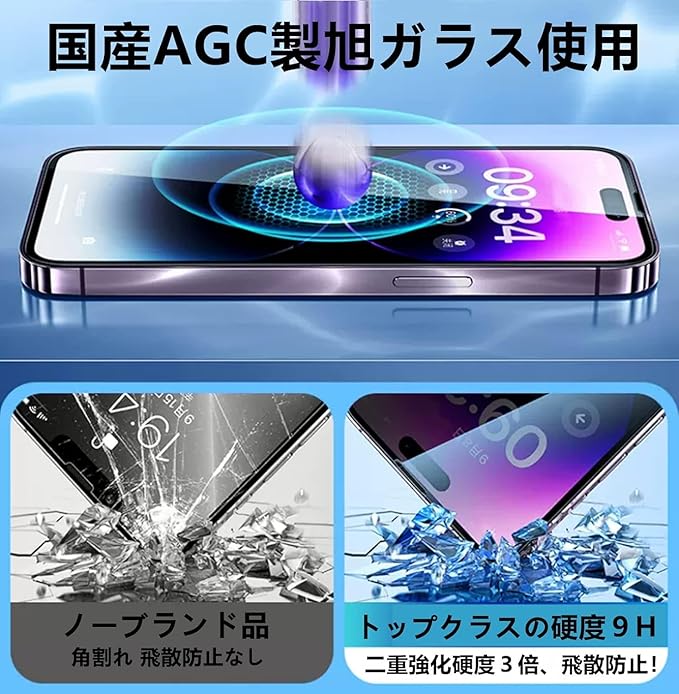 ガイド枠付き【 4枚入り 目に優しい】iPhone15ガラスフィルム ブルーライトカット 2枚+レンズフィルム2枚 6.1インチ 国産AGCガラス使用 極薄 気泡なし 硬度9H 液晶保護フィルム ラウンドエッジ