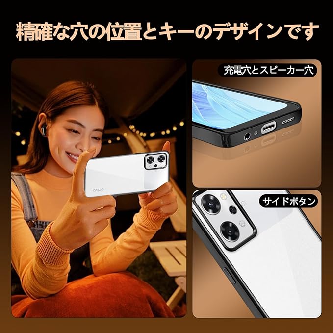 OPPO Reno7 A ケース クリア OPPO Reno9 A ケース OPG04 A201OP カバー 耐衝撃 メッキ加工 スマホケース ストラップホール付き 軽量 薄型 透明 持ちやすい TPU素材 ブラック