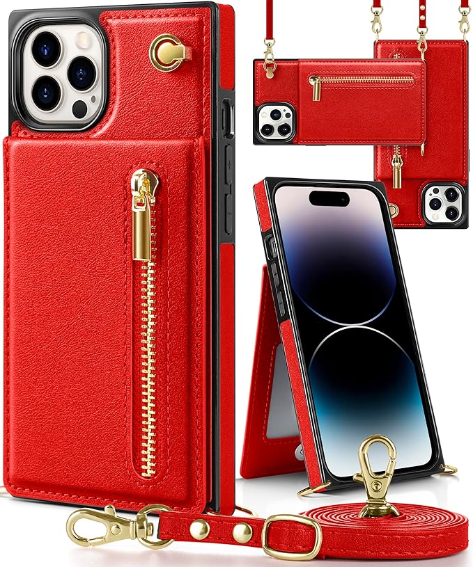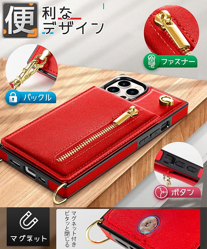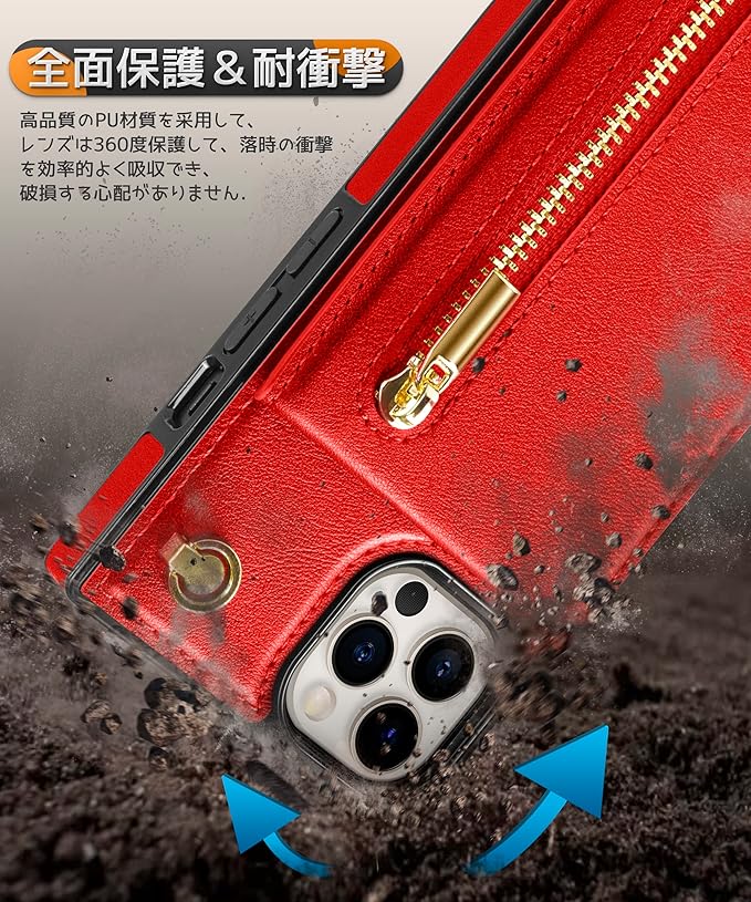 YIHARA iphone 15 Pro Max ケース手帳型 アイフォ15 プロマックス スマホ ケース 財布型 iPhone 15 Pro Max 適用 携帯ケース 肩掛け 首かけ 斜めがけ ショルダー アイフォン15 Pro Maxケース手帳型 背面 カード収納 ストラップ付き 上下開 長さ調整可能 レッド