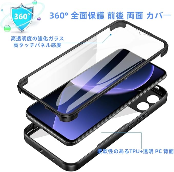 『前+後 両面 360°全身保護』 9H硬度ガラス+柔軟性のあるTPU+透明 背面PCバック素材で制作しましたが、衝撃に強く耐久性に優れ、落下や振動、衝突からスマートフォンを保護してくれます。付いた埃や汚れは簡単に拭き取られるので、心地よいタッチ感が実現できます。