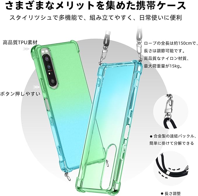 Xperia 1 V ケース ショルダー クリア SO-51D/SOG10 カバー 耐衝撃 TPU 肩がけ 首掛け 紐付き 薄型 縄掛け ケース 斜めかけケース 軽量 取り外し可能 調節可能な ショルダー 肩がけ 首掛け 紐付き 緑