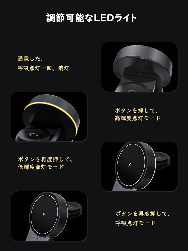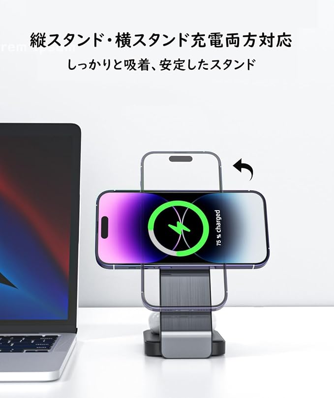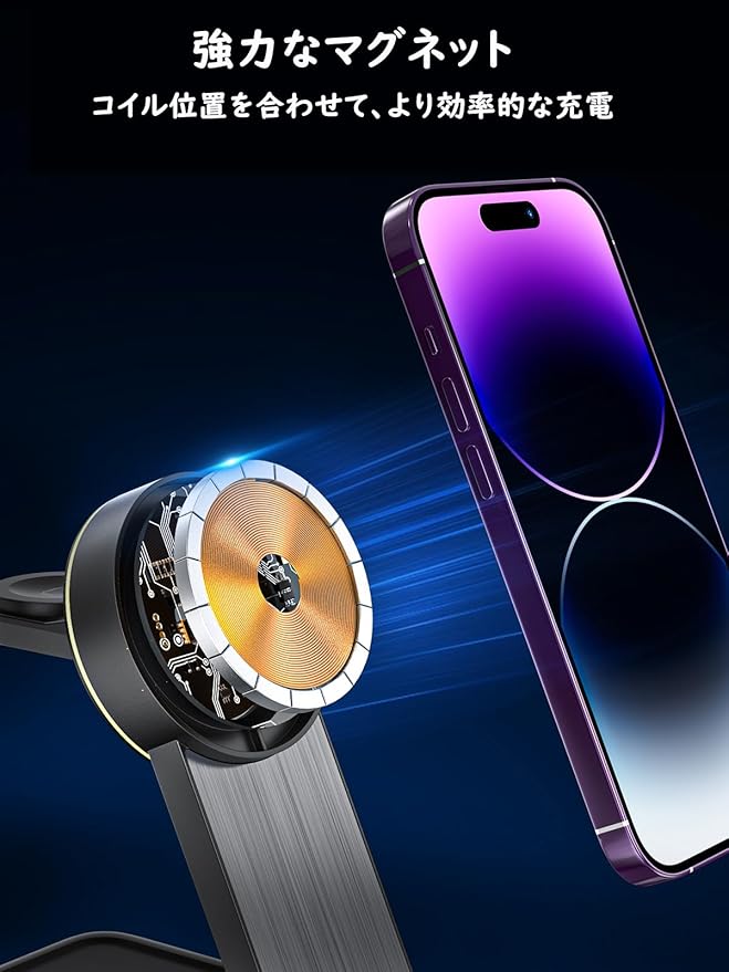 【3in1 magsafe充電器、ピタッと吸着】このワイヤレス充電器は iPhone、AirPods、Apple Watchを同時に充電でき、一台三役でお使い勝手が良いです。iPhone充電の所に強力なマグネット内蔵、iPhoneを本体に近づけるだけで正しい位置に吸着します。頻繁にコネクタを抜き差し必要がなく、置くだけで充電可能になり、家庭も仕事も 適しています。※※急速充電はQC3.0 9V/2Aと以上のアダプター(別売り)が必要です。