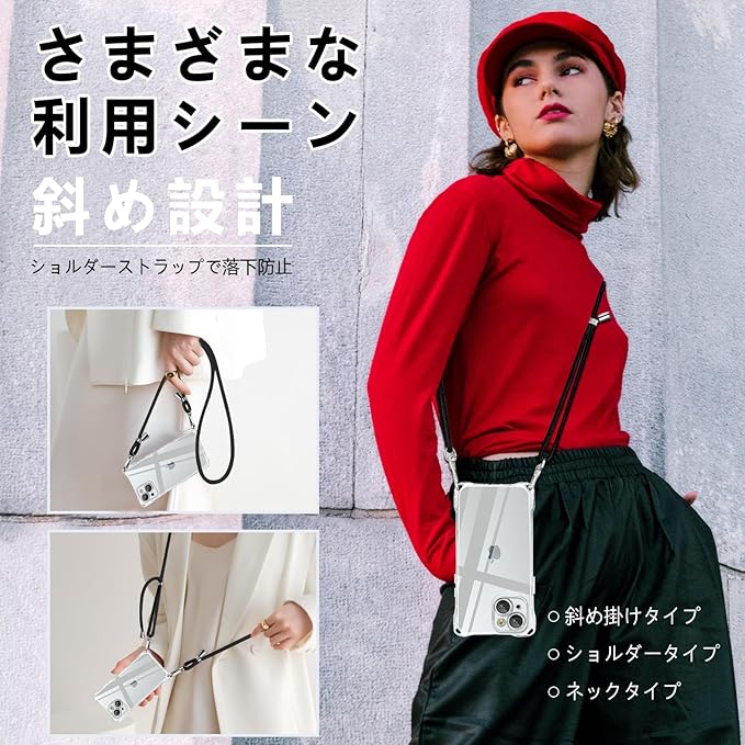 iPhone15Plus ケース ショルダー クリア 肩掛け 首掛け アイフォン15Plus スマホケース 斜めかけケース カバー 耐衝撃 軽量薄型 全面保護 人気 韓国 柔軟 高質感(ブラック)