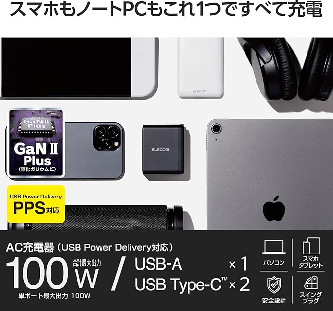 エレコム 充電器 100W 3ポート USB PD対応 急速充電器 3台同時充電 折りたたみ式プラグ PSE技術基準適合 ブラック ACDC-PD65100BK