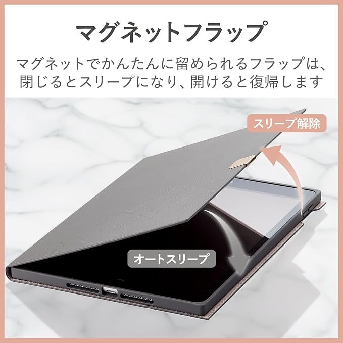 不使用時に画面部分を保護するフラップが付いています。フラップを閉じるとスリープモードになり、開けるとスリープから復帰します。
