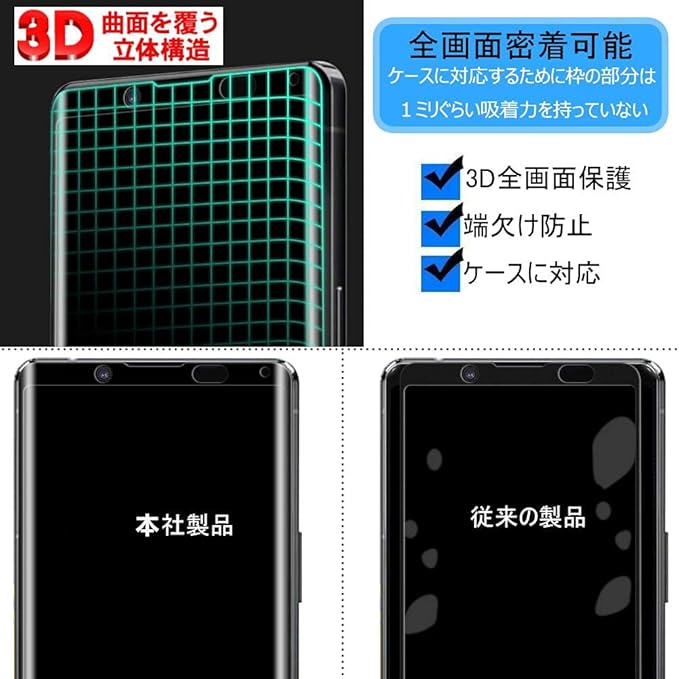 【3Dラウンドエッジ】最先端技術の3Dラウンドエッジ加工により、曲面の完全カバーを実現。枠部分までガラスなので、落下や衝撃による端欠けを防ぎ、保護機能を更に強化