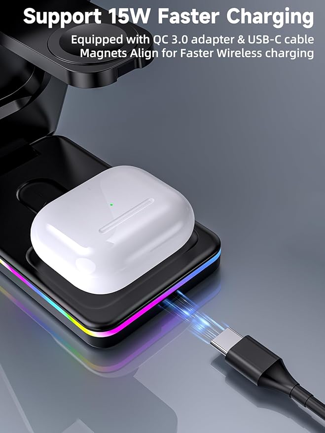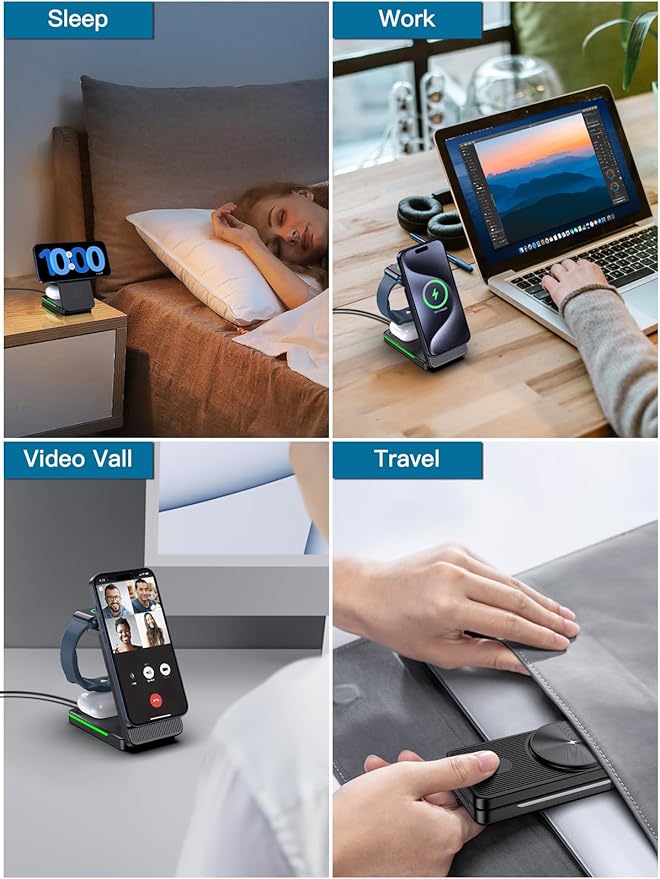 【3-in-1 magsafe充電器 apple】当社の3-in-1マグセーフチャージャースタンドを使用して、ワイヤレス充電と強力な磁力の究極の便利さを体験してください。このオールインワンのソリューションは、iPhone、Apple Watch、AirPodsの電源をまとめて供給し、からまったコードや乱れたケーブルの手間を省くことができます。自宅、オフィス、旅行中、会議に参加している場合でも、当社のチャージャーはあなたの忙しいライフスタイルの理想的なパートナーです。