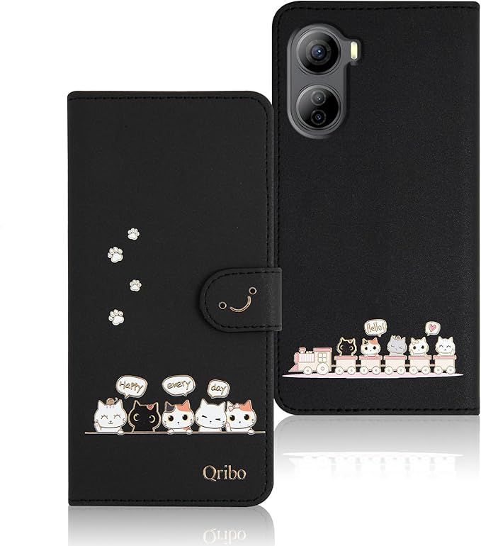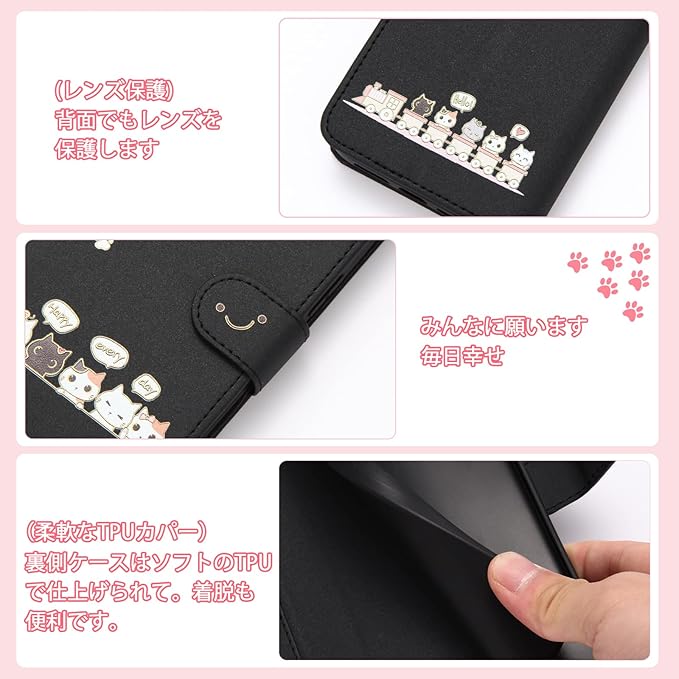 Qribo Libero 5G IV ケース 手帳型 リベロ5g iv ケース シンプルなのに可愛いデザイン エンボス加工猫柄 ZTE Libero 5G IV カバー うれしい気持ち 6.6インチ対応 A302ZT ケース リベロ5g4 スマホケース リベロ5g 4 ケース 薄型 Libero 5G 4 ケース 防水 の耐久性 滑り防止 美しい 贈り物 友達 - ブラック
