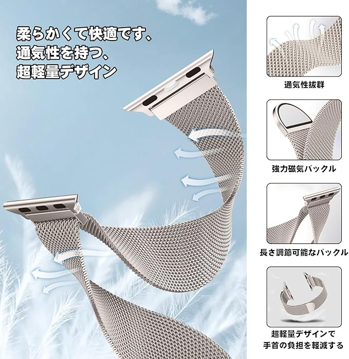 【優れた素材の通気性】対応 アップルウォッチバンドのデザインは通気性を考慮しており、メッシュ構造が手首周りの通気性を向上させ、汗をかく季節でも蒸れずに快適にご使用いただけます。独特のマグネットロック
