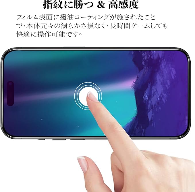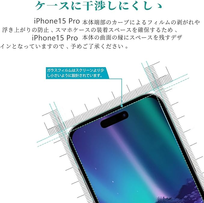 『対応機種』 iPhone15Pro (6.1インチ) 専用設計 携帯は端部のカーブがフィルム剥がれ、浮きの防止、スマホケース装着スペース確保のため、機器の曲面の縁にスペースを残すデザインとなっています。画面操作時の手触りをさらに改良し、より滑らかでサラサラな使い心地を実現しました。