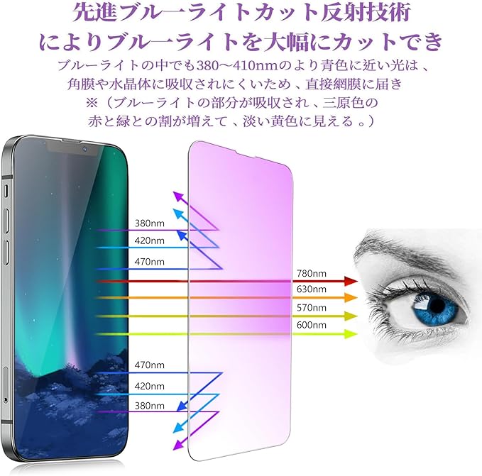 『ブルーライトカット機能 』先進ブルーライトカット反射技術によりブルーライトを大幅にカットでき。 ちなみに、製品は本物同様正面から見ると、淡い黄色に見え、側面から見ると、青紫色に見えます。(ブルーライトの部分が吸収され、三原色の赤と緑との割が増えて、淡い黄色に見える。) (ご注意:色あいなど画像と若干の違いがある場合があります。予めご了承下さい。)