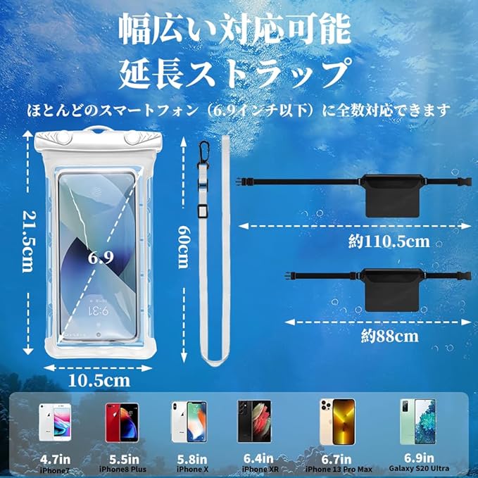 防水ケース スマホ 2個セット 防水バック【2024強化版&両面高機能&防水ポーチ付き】アイホン 水中撮影 完全防水 IPX8認定 SGS国際認証 すまほ ぼうすい 小物収納 保護密封 防水ポーチ 防水ウエストポーチ添付 携帯ケース 全面クリア カバー 透明 タッチ快適 最大6.9インチ対応 通話 小物管理 風呂 海 プール 釣り 雨 潜水 水泳 雪 温泉など適用 (ホワイト)