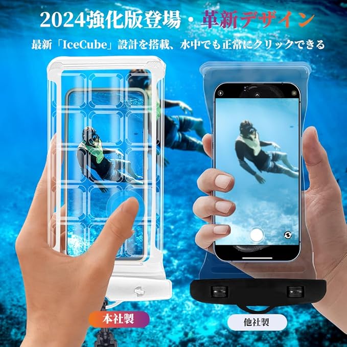 ?【2024強化版登場水中タッチ】従来品と違っての携帯防水ケースは最新改良デザインを採用し操作感&透明度&触感がアップどこにいても簡単に操作できるための両面の革新的なデザイン。さらに最新「IceCube」設計を搭載。「水中ではスクリンにタッチできません」という問題を解決し、水中でも正常にクリックして写真を撮って、録画して自分の冒険経験を記録できる。普段使うときは、より良い体験のため、平滑な面をお勧めします。水中使うときは、より良い体験のため、凹凸の面をお勧めします。?【安全防水IPX8認証完全防水】IPX8(JIS保護等級8級と同等)、30メートルまで水没しても内部に浸水することがなく、水深10mで2時間の潜水が可能です。革新的で開閉が簡単なレバーは、他の防水ポーチよりも30%強力で気密性に優れています。(ご注意:念の為、事前に必ずスマートフォンの代わりに1枚の紙を防水ケースに入れ、そ