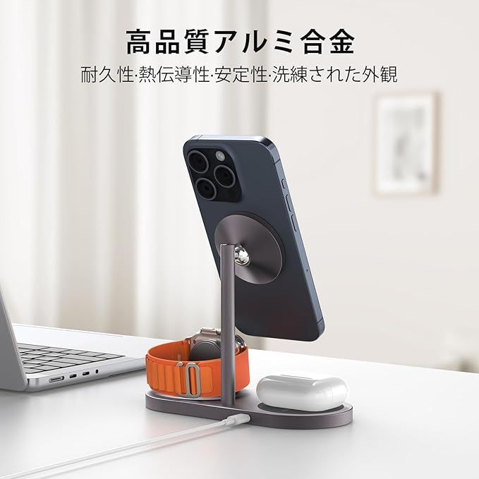 【一台三役ワイヤレス充電環境】この3in1充電器は、iPhone16/15/14/13/12シリーズ・AirPods・アップルウォッチに対応しておりますので、異なる充電器を使う手間を省き、これ一台で完結。絡まりやすいケーブルを使用しないため、デスク周りやナイトテーブルが常に整然とした状態を保てます。さらに、充電中のスマホを所定の位置にしっかり固定し、瞬時に位置合わせが可能な磁気整列機能を備えています。まさに置くだけ充電の快適さを提供します。