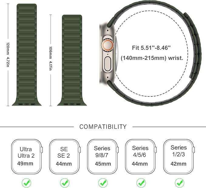 【対応機種・サイズ】Suphart磁気シリコン時計バンド コンパチブル Apple Watch Ultra2/Ultra 49mm および Apple Watch シリーズ 10、シリーズ 9、シリーズ 8、シリーズ 7、シリーズ 6、シリーズ 5、シリーズ 4、シリーズ 3、シリーズ 2、シリーズ 1、SE 46mm/45mm/44mm/42mm。5.51インチ〜8.46インチ(140mm〜215mm)の手首に適しています。