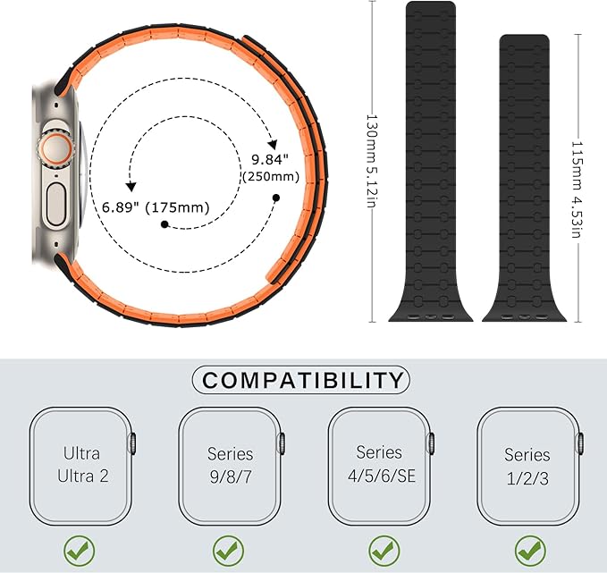 すべてのモデルに対応: ZZDZZシリコン磁気時計バンドは、Apple Watch 42mm 44mm 45mm 46mm 49mm、iWatch Series SE2/SE/10/9/8/7/6/5/4/3/2/1に対応。 6.1インチから8.8インチ(155mm-225mm)の手首に適しています。 ヒント:時計の裏側のサイズを確認し、必要に応じて正しいサイズを選択してください。