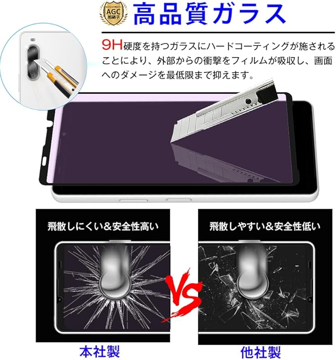 【高品質ガラス】日本旭硝子製ガラス素材を使用しており、9Hの表面硬度を誇る保護フィルムです。通常のPETフィルムより4倍の強度、鍵やカッターなどの鋭利な物を当てても損傷なく使用する事が可能で、摩擦や傷から液晶ガラスをしっかり保護します。万が一強力な衝撃でガラスフィルムが割れてしまっても、破片の飛び散りを防ぐ飛散防止コート処理で、画面をしっかり保護、スマホ本体と共に手の怪我の心配もありませ