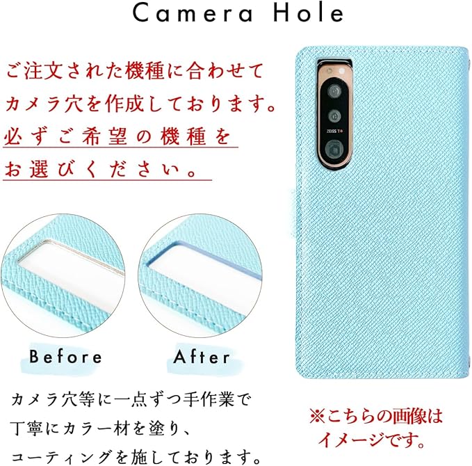内側にカードなどが収納できるポケット付き。機種に合わせたカメラ穴等が開いております。