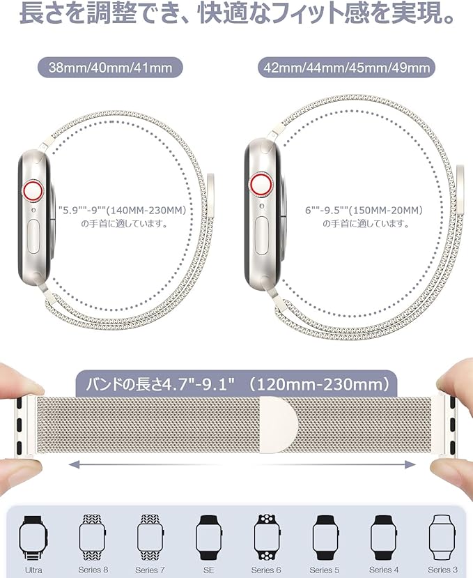 Conkoo ステンレス製 マグネットクラスプ ベルト、41mm/40mm/38mm、無段階調節、通気性、Apple Watch Series Ultra/Ultra 2/9/8/7/6/SE/5/4/3/2/1対応