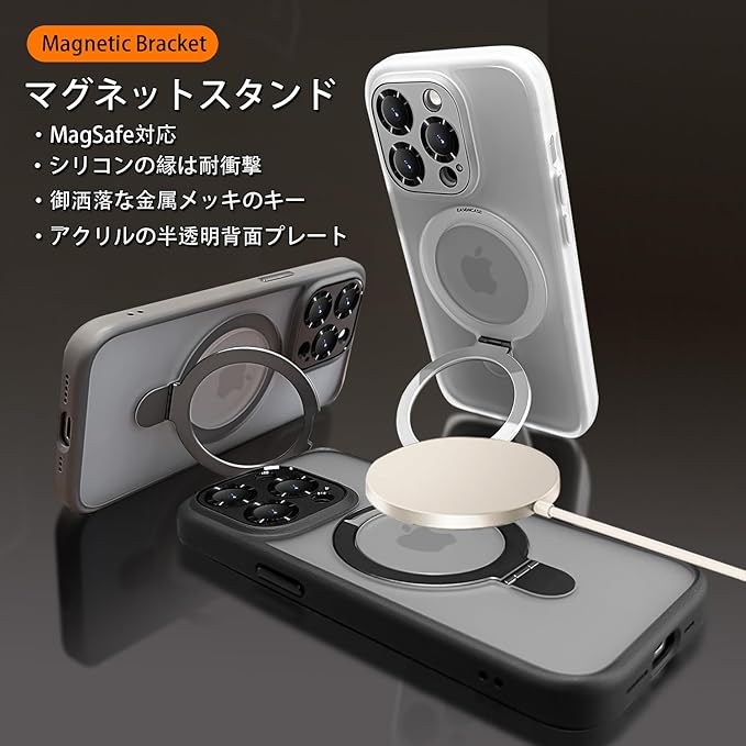 【強い磁気の隠しスタンド】アップグレードのスタンドは強いマグネットを内蔵され、MagSafeを適用しながらワイヤレス充電にも対応します。車載ホルターや冷蔵庫、金属があるところに貼り付けたのまま動