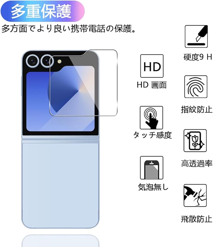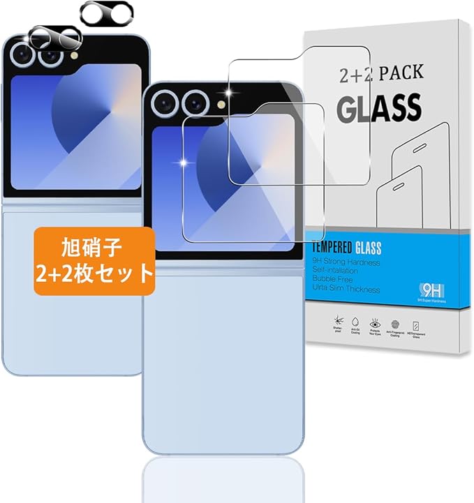【2+2枚セット】 対応 Galaxy Z Flip6 SC-54E ガラスフィルム + カメラフィルム 【日本旭硝子 硬度9H】 対応 ギャラクシー Z Flip6 フィルム 強化ガラス 液晶 保護フィルム 3D Touch対応 、高透過率 、気泡ゼロ 、超薄型 、飛散防止 、高感度 、衝撃吸収 、指紋防止 、ラウンドエッジ加工 、簡単貼り付け
