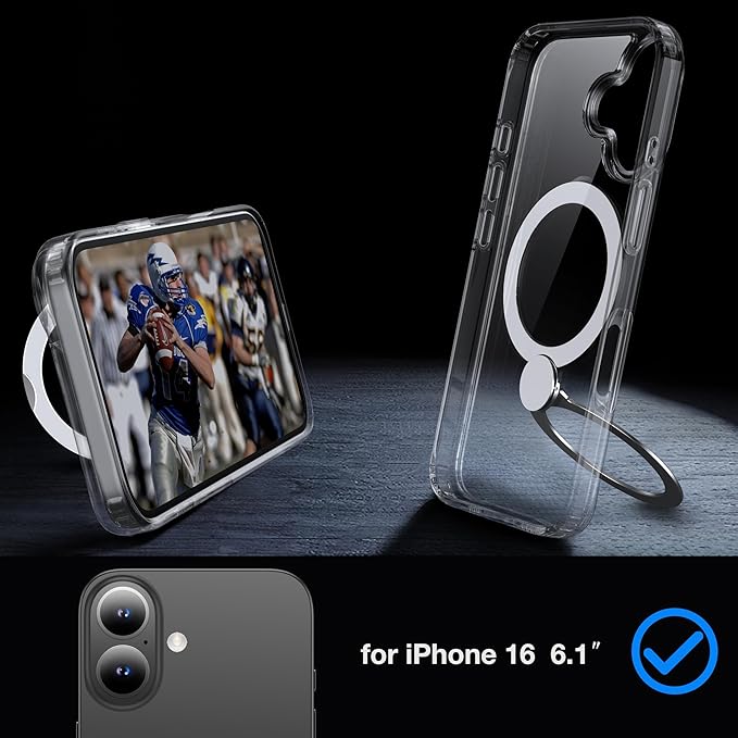 【米軍MIL規格・MagSafe対応】FNDMIL 360 回転 iPhone 16 用 ケース [滑り止めテクスチャ] [目に見えないスタンド]縦横両対応 シリコンフレーム 透明ハードケース アイフォーン16 用 ケース マグセーフ対応 ワイヤレス充電対応 薄型 (クリア)
