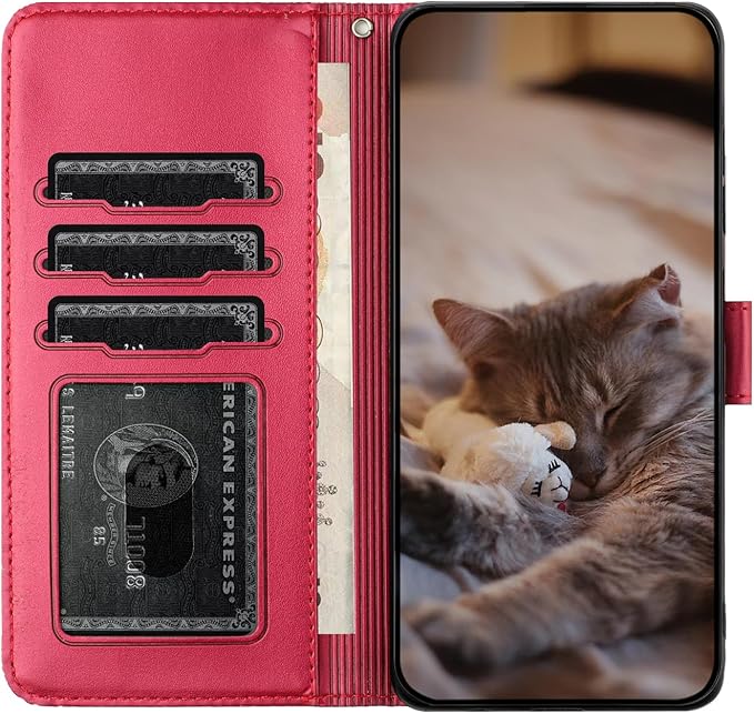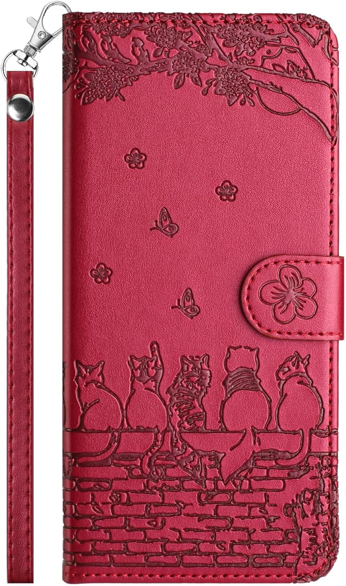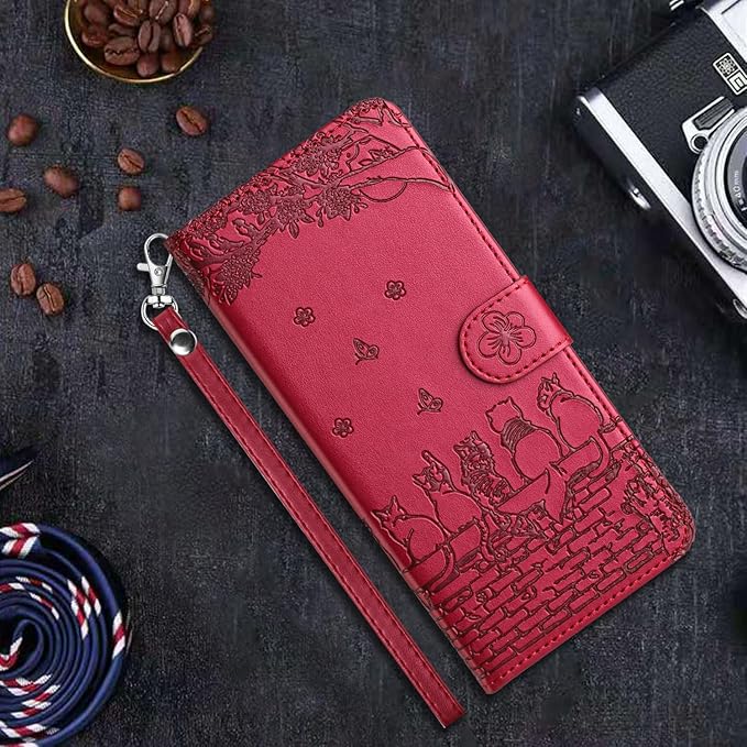 TEDTIKJT iPhone 16e ケース手帳型 レザー iPhone 16E カバー 内蔵マグネット軽量 耐衝撃 iPhoneSE4 ケース 手帳型 スマホケース 桜の下の猫 アイホン16E ケース iPhone 16 E カード収納 スタンド機能 収納 財布型 人気 高級PUレザー 薄型 マグネット式 iPhone 16E ケース -赤