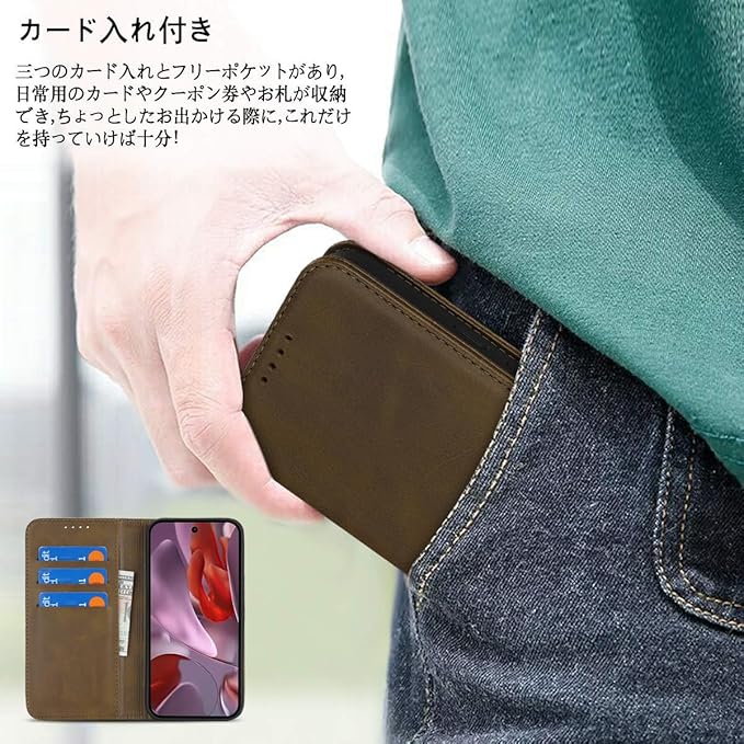 【機能性①】:レトロの表面(高品質のPUレザー)+優しい裏面(柔軟なTPUカバー)と組み合わせ、衝撃吸収機能が良いのです、しっかりの二重保護でスマホ本体を守り抜きます。